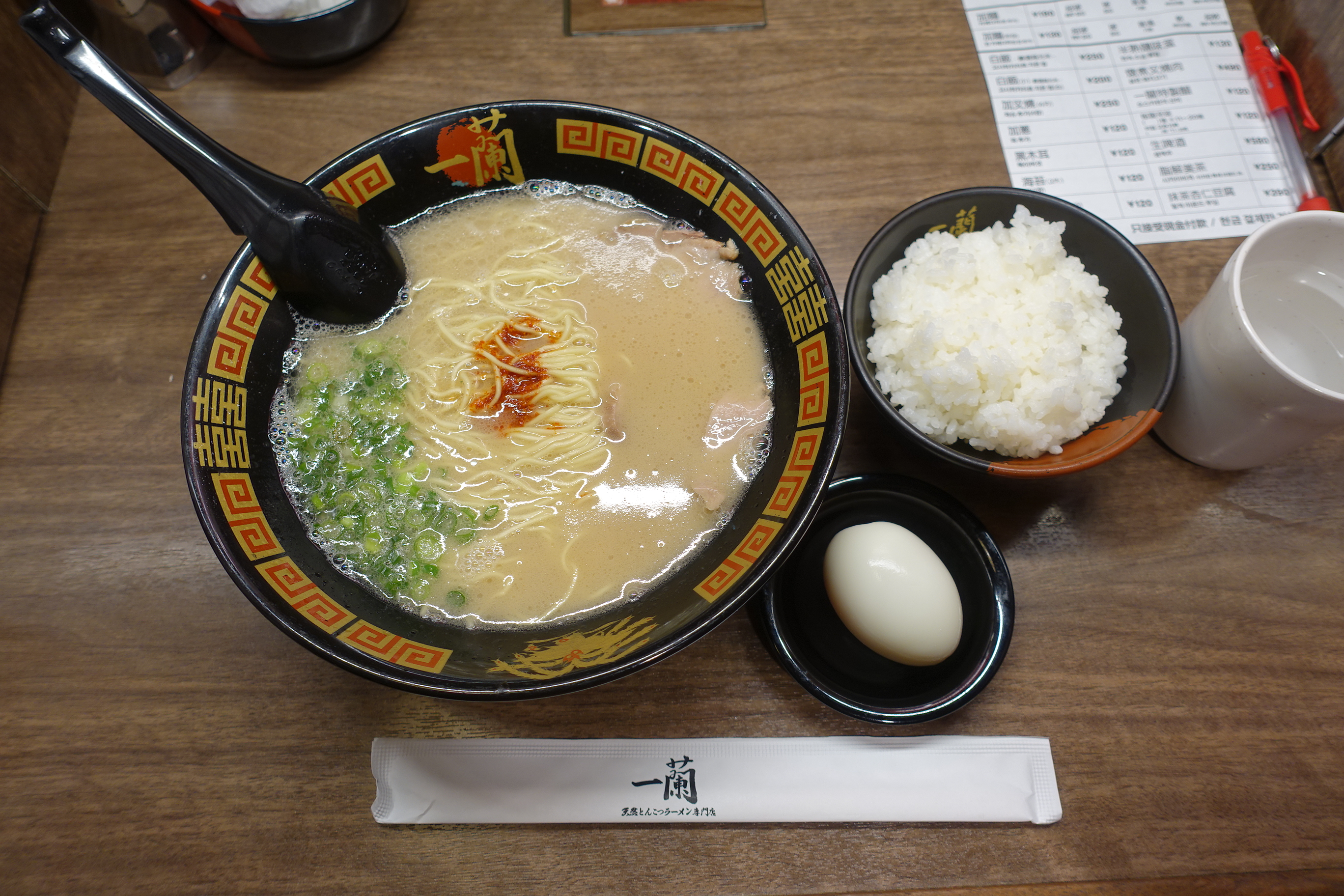저는 기본 라멘과 밥 小자, 삶은 계란 그리고 아몬드 말차 푸딩을 주문했습니다.