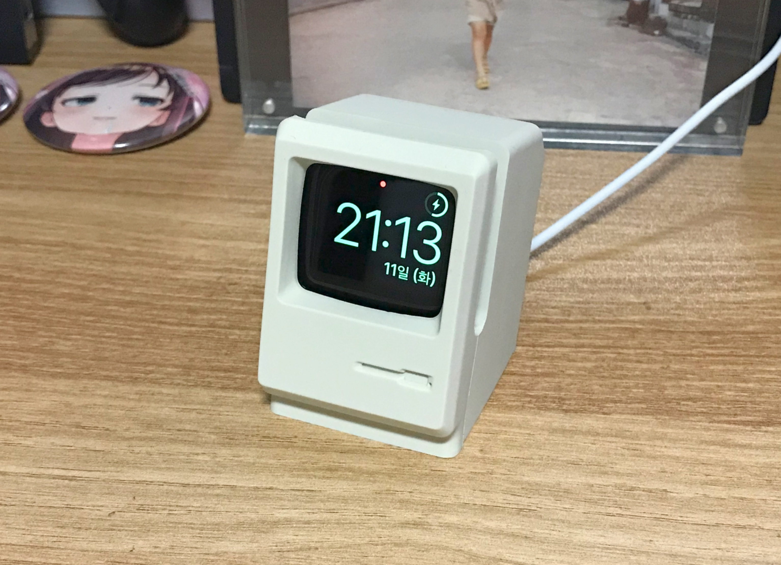 W3에 꼽아 충전 중인 모습입니다. 사진을 아이패드로 찍었더니 시계 화면의 색상이 조금 흐리게 담겼네요. 실제로 보면 선명한 초록색을 띄고 있어서 굉장히 예쁩니다.