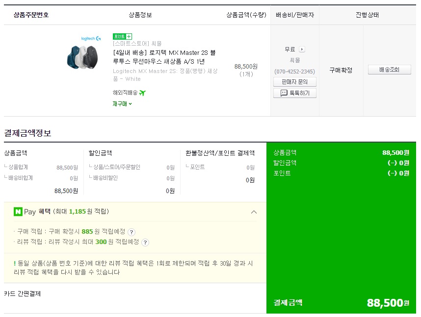 and paid 88,500 won without shipping.
