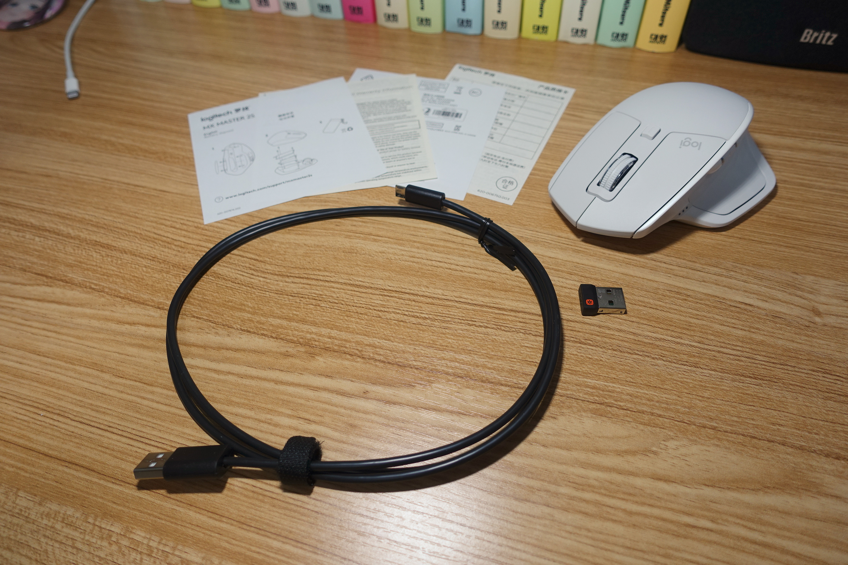 構成品はマニュアル、USB 充電ケーブル、unifyingレシーバーそして無線マウスです。
