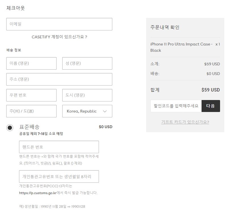 저는 우선 개인통관고유번호를 적었습니다.